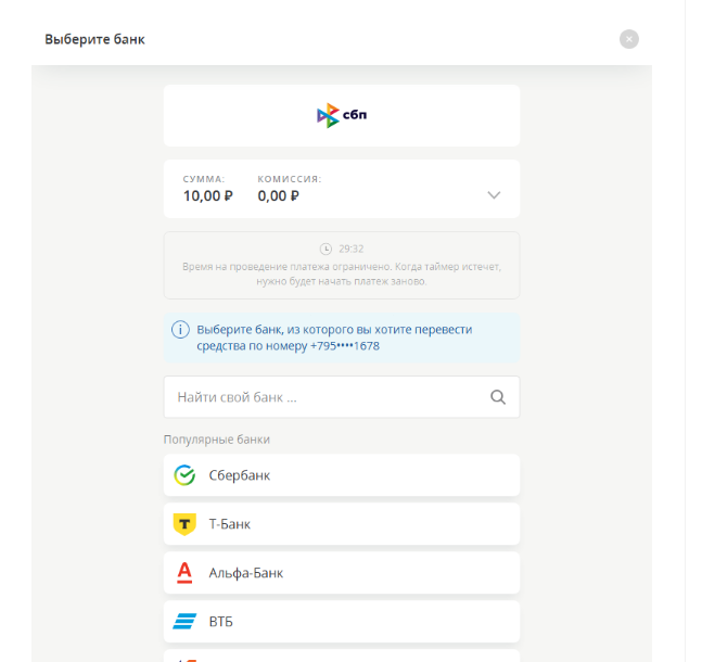 3. Выберите любой банк, где у вас есть счет. Номер телефона в банке должен быть таким же, как в Кошельке — это важно, чтобы мгновенный платеж работал